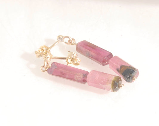 Pink Watermelon tourmaline crystal - 14k post dangles