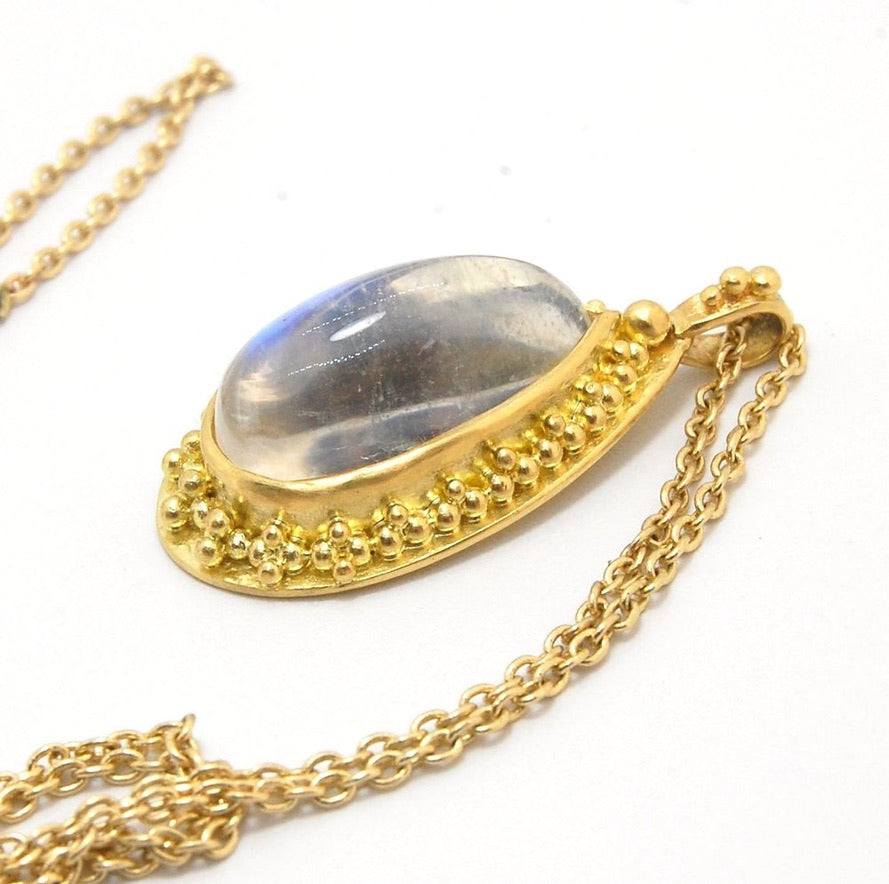 It begins with alloying 18k and 22k from 24K gold, creating and sorting the granules, and creating sheet using a hand-cranked rolling mill. Creating, cleaning and surface preparation of the components, fusing the bezels and granules, and joining components and findings with controlled fusing. Then it is ready for light sanding and polishing and a good thorough cleaning before setting the stones.