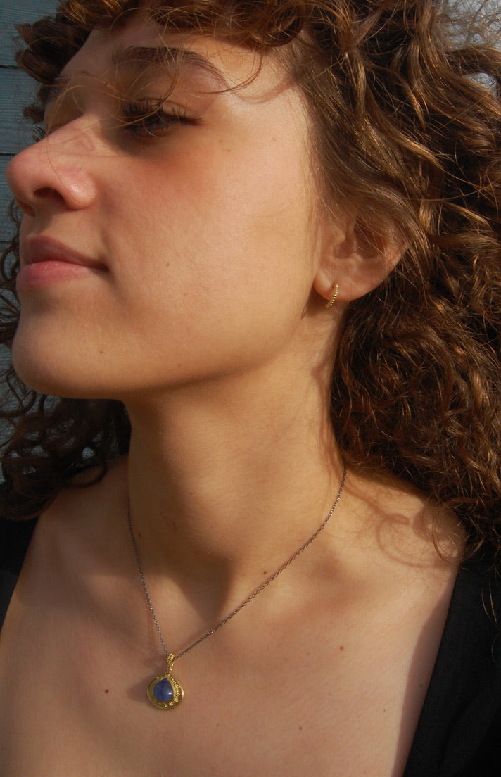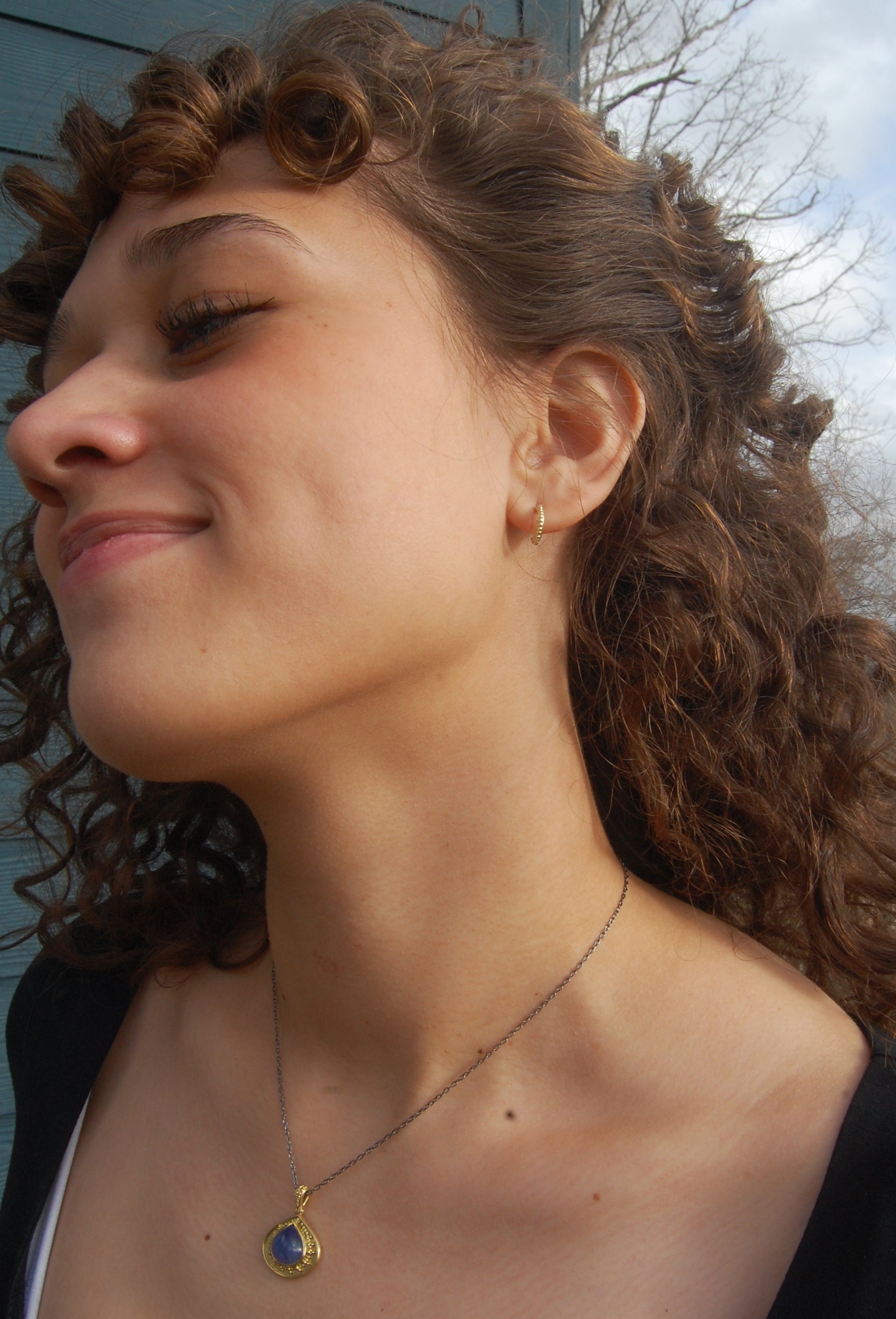 This super blue teardrop-shaped Tanzanite is bezel-set in rich 18k gold bezel setting surrounded by 18k gold granulation with a granulated bail that has been riveted on for more movement. Hung on a 14k yellow gold, 18” cable chain with a C clasp.