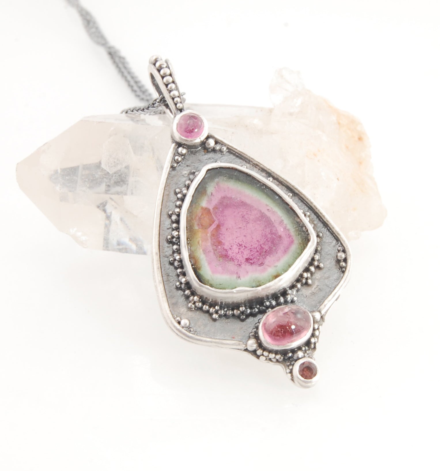 This One of a Kind Pendant has a lovely Watermelon Tourmaline Slice with a brown freckle, a pink oval tourmaline cabochon, a round pink tourmaline and a pink faceted tourmaline bezel-set in Fine Silver Granulation with a granulated bail. This lovely piece can be hung on an oxidized or polished sterling silver 16", 18" or 20" chain. Your choice at checkout.