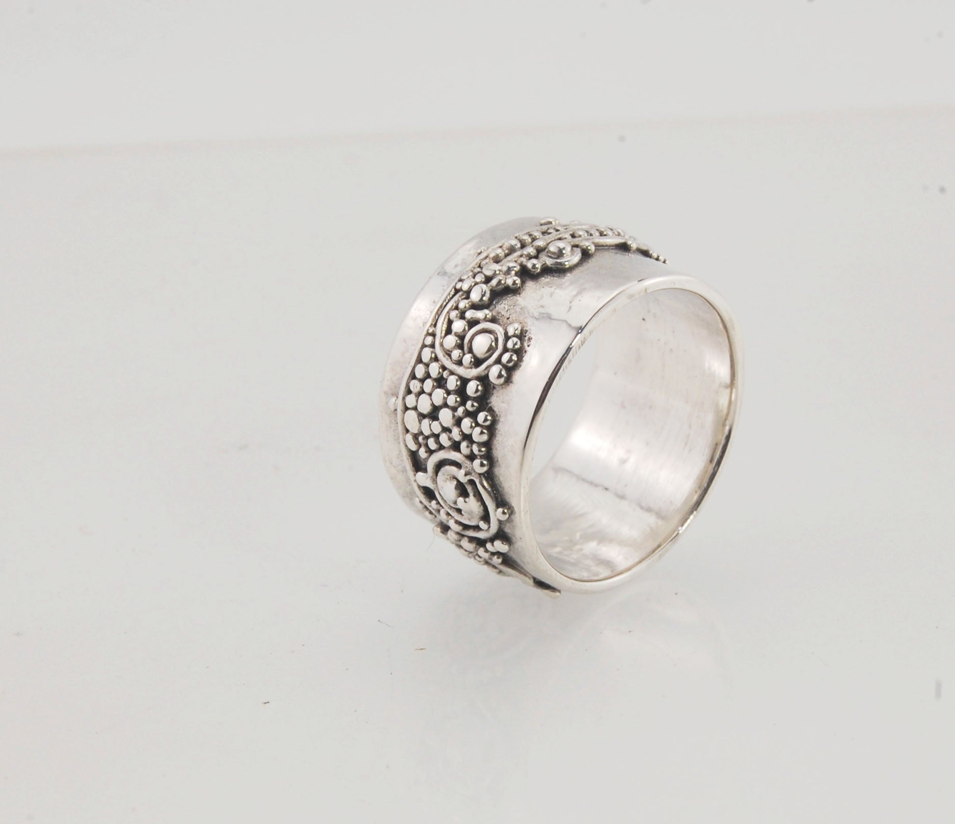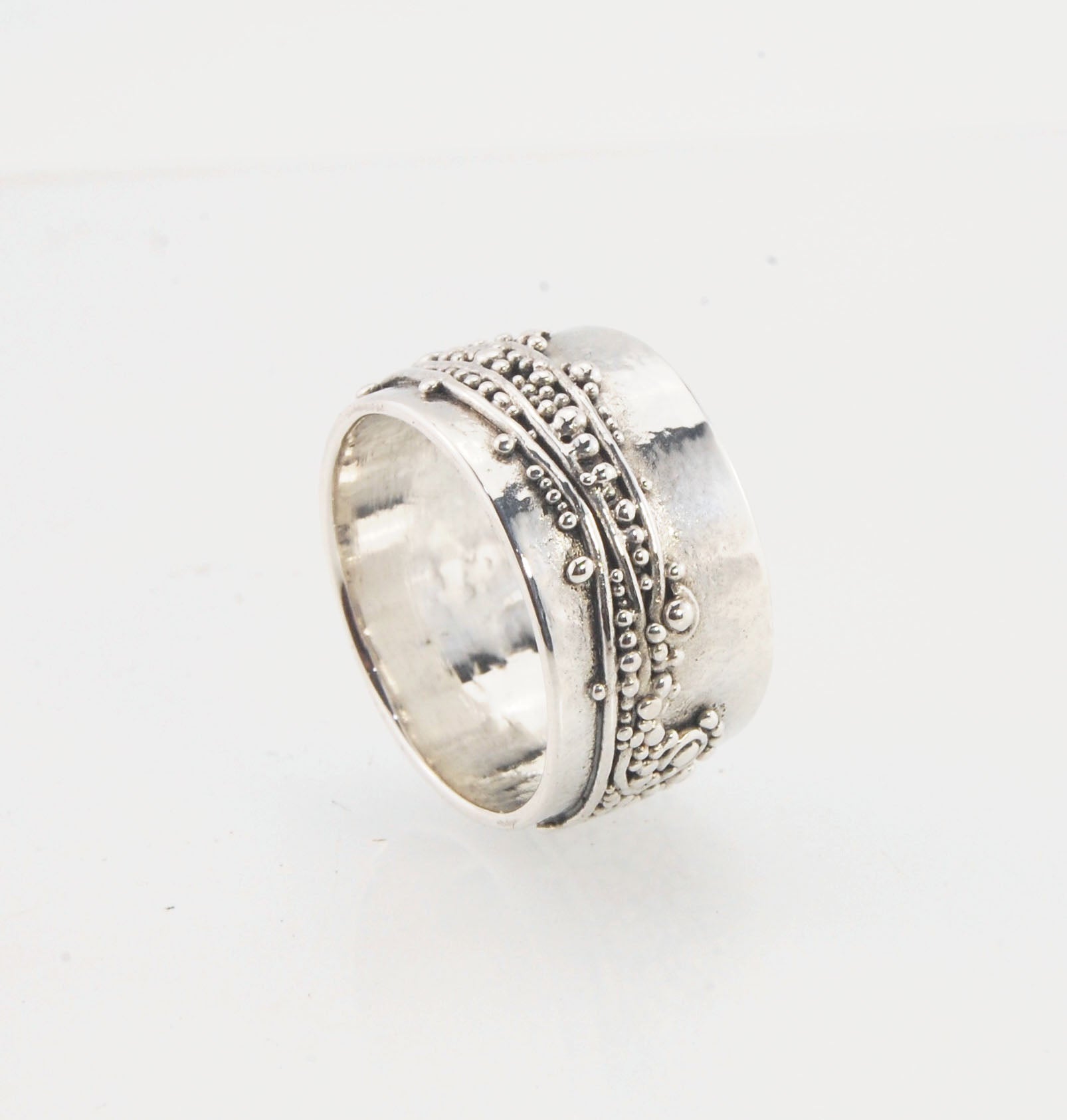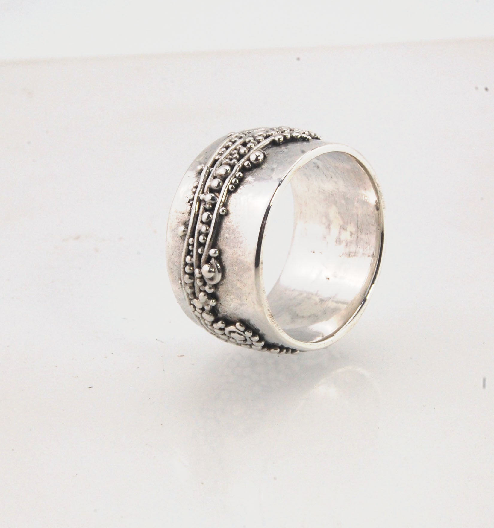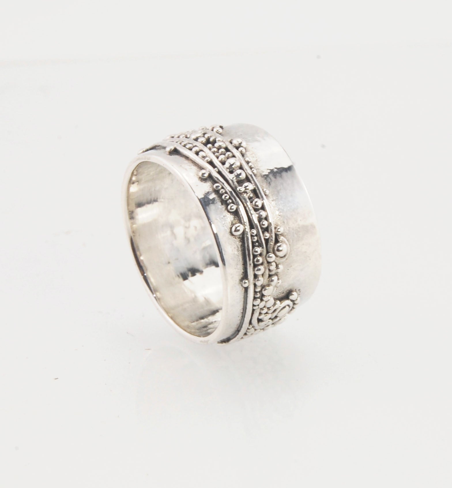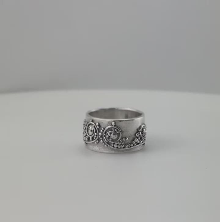 Long curls of silver peppered with tiny granules of silver in a wave pattern all the way around the ring. Handmade for you in the size you request. This 8mm or 11mm wide band is made with a fusing process called Granulation.